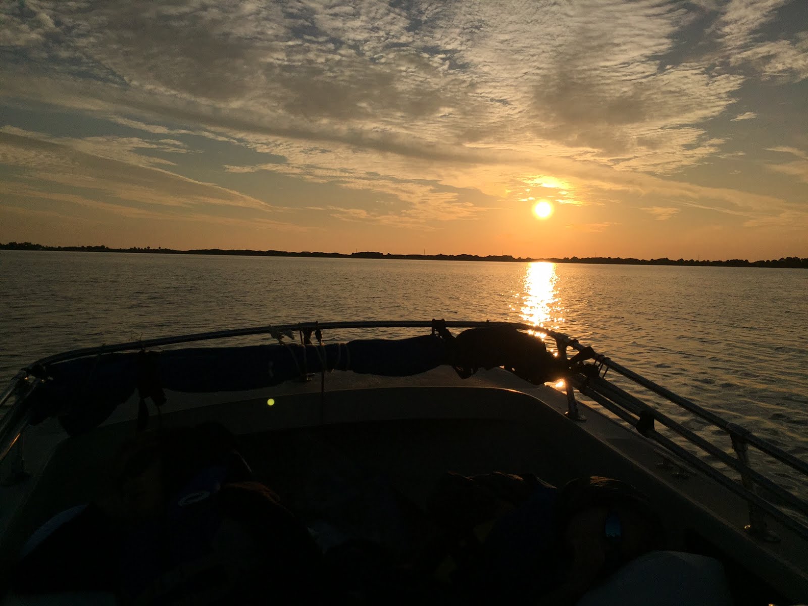 We watched dolphins after walking the beach. We then caught sharks! After great day, there was the most beautiful sunset to cruise home into!